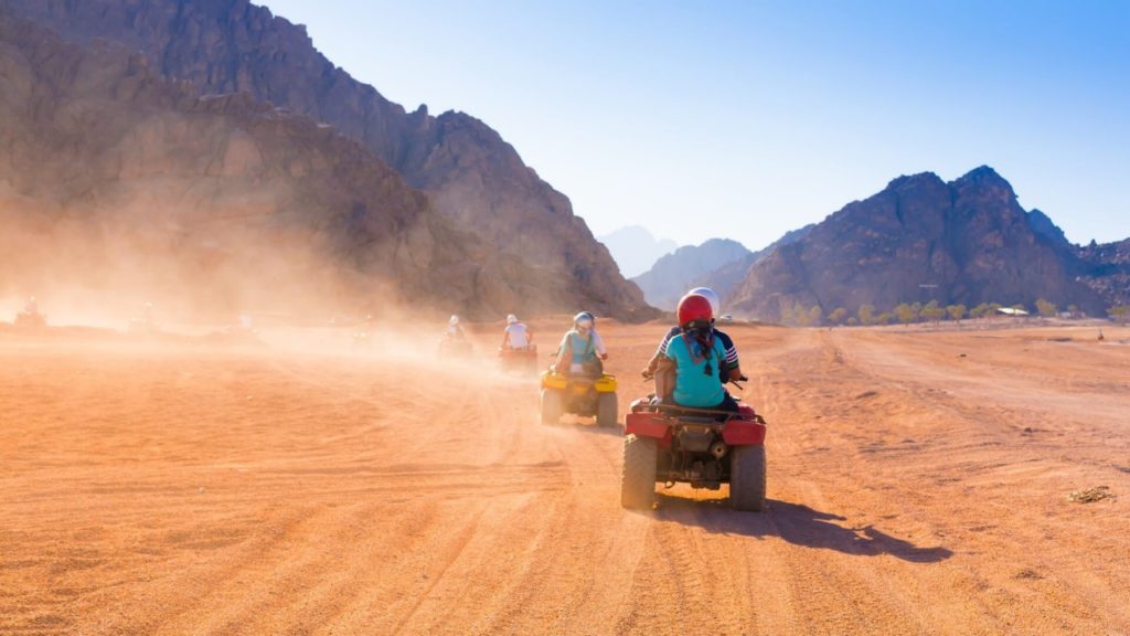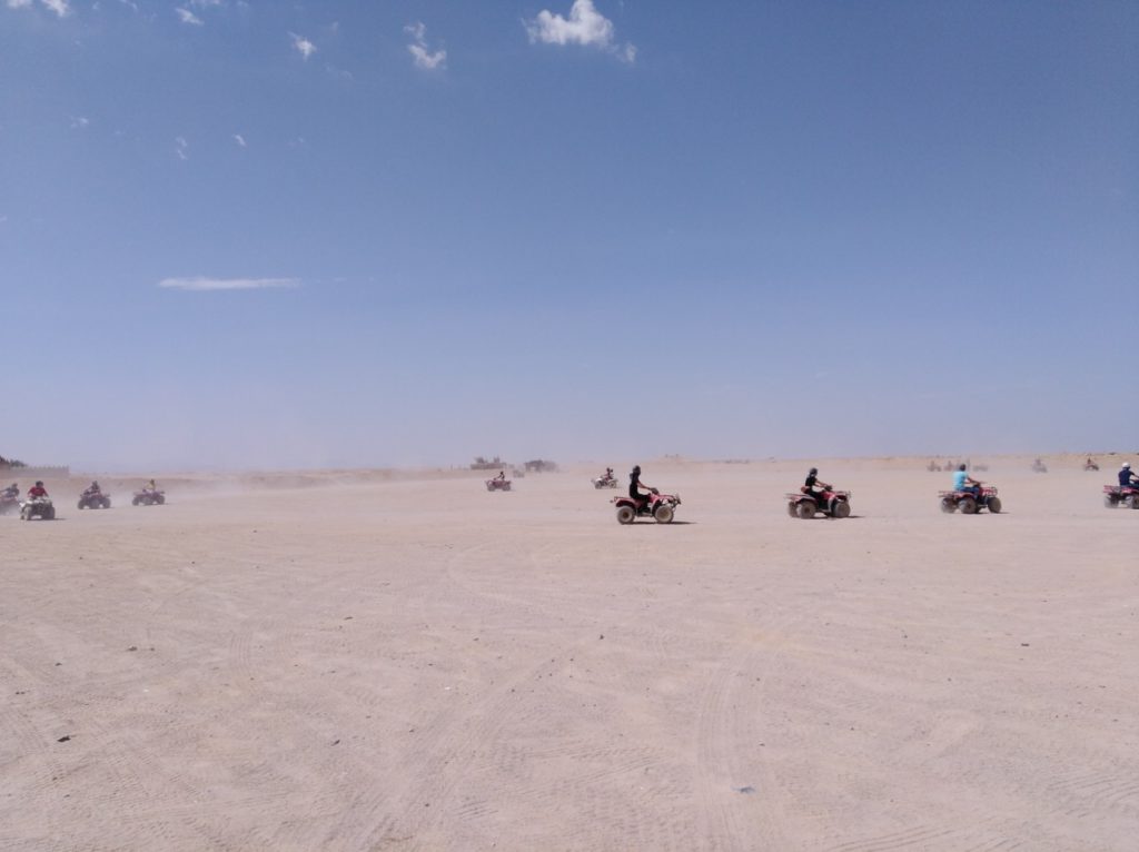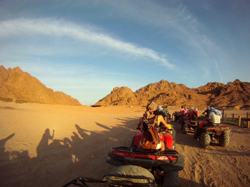 Це захоплююча пригода почнеться з поїздки на джипі в пустелю. Далі подорож триватиме на квадроциклах, під час якого ви побачите справжній міраж і зможете покататися з піщаних дюн. Попереду — запам’ятовує зустріч з бедуїнами, які запропонують мандрівникам відпочити і покуштувати ароматного чаю, катання на квадроциклах, баггі (спортивному автомобілі) і верблюдах. У насичену програму також включено відвідування міні-зоопарку, тераріуму.